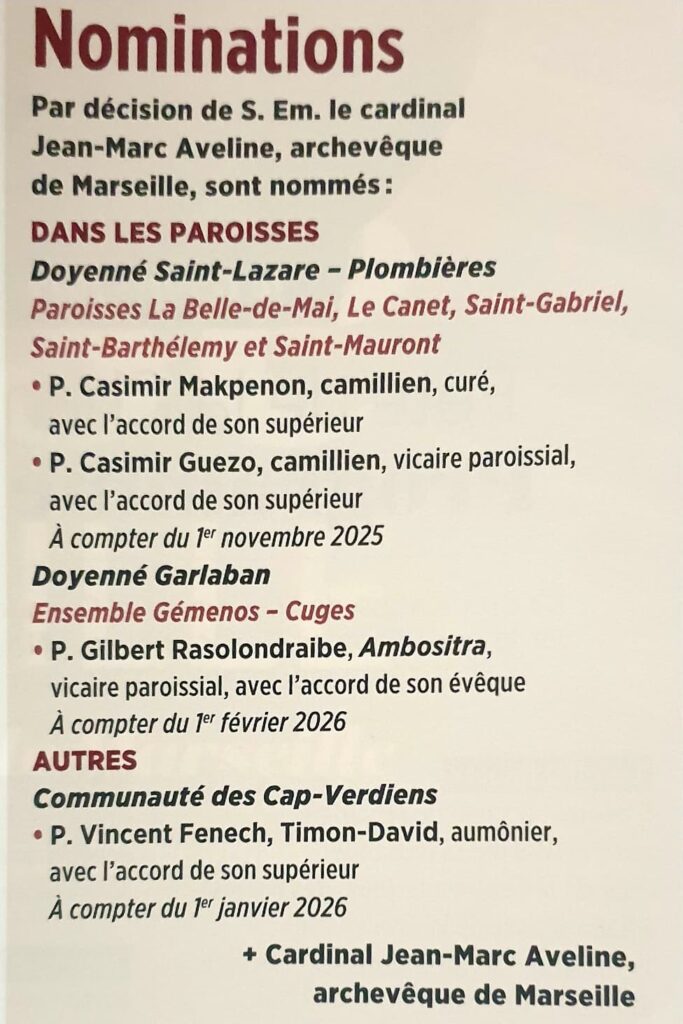 Par décision de Son Eminence le Cardinal Jean-Marc Aveline, archevêque de Marseille, le Père Gilbert Rasolondraibe est nommé vicaire paroissial à compter du 1er février 2026.